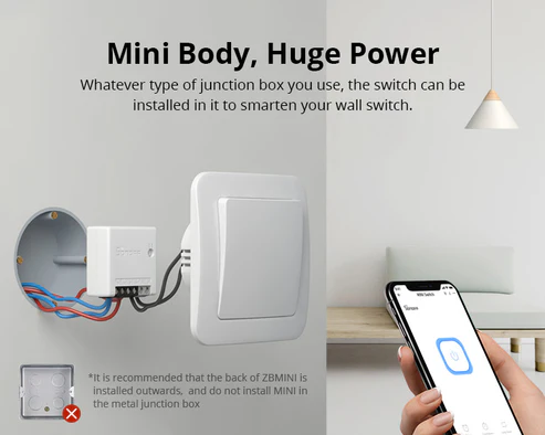 Turn your traditional wall switch into a smart switch with the SONOFF ZBMINI Zigbee Smart Switch. This compact Zigbee relay module installs behind a wall switch to enable remote lighting control, automation, and smart home integration.