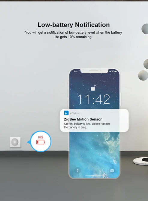 Zigbee PIR motion sensor with instant alerts and smart automations via eWeLink app. Works with compatible Zigbee hubs for lighting, security and energy savings.